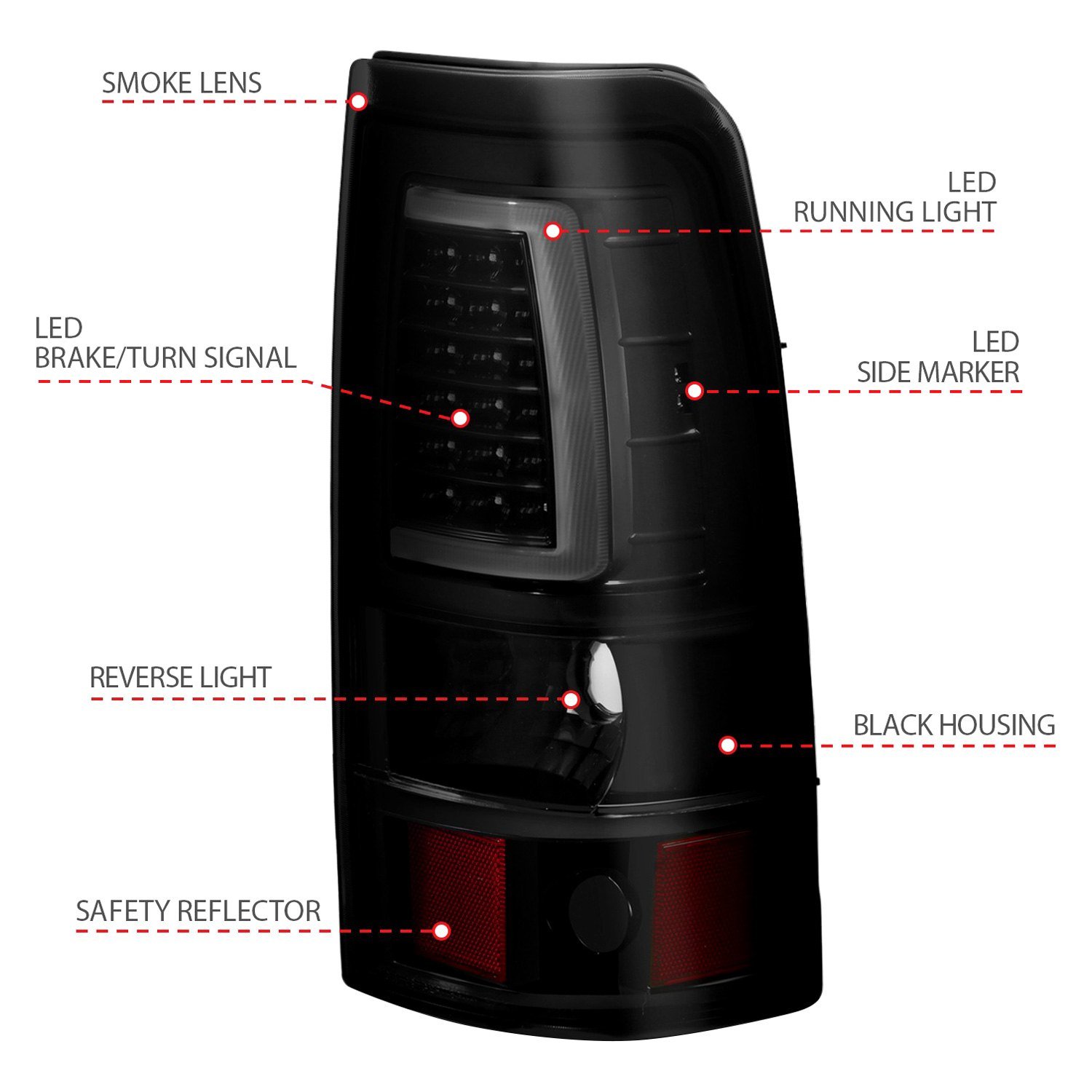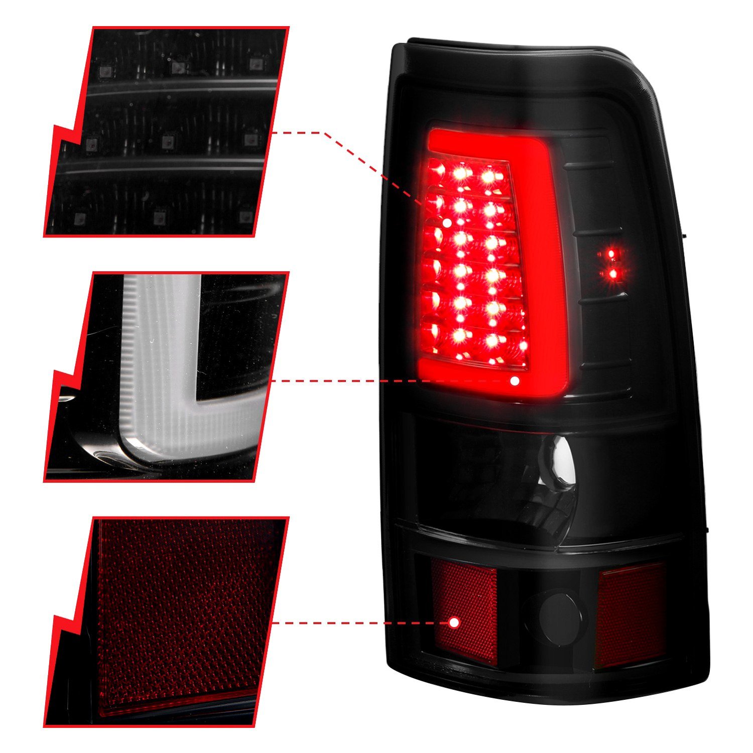 Driver and Passenger Side Black/Smoke Plank Style Fiber Optic LED Tail Lights (311331) by Anzo®. 1 Pair. Black housing, smoke lens. Tired of your dull factory tail lights and feel a strong need to upgrade the rear of your auto with something really special? Featuring far more brightness and endurance than stock bulbs, these stunning tail lights by Anzo are just the ticket to transform a simple piece of machinery into a classy vehicle. These lights combine fiber optic strips which act as running lights and super bright LEDs that provide excellent illumination.