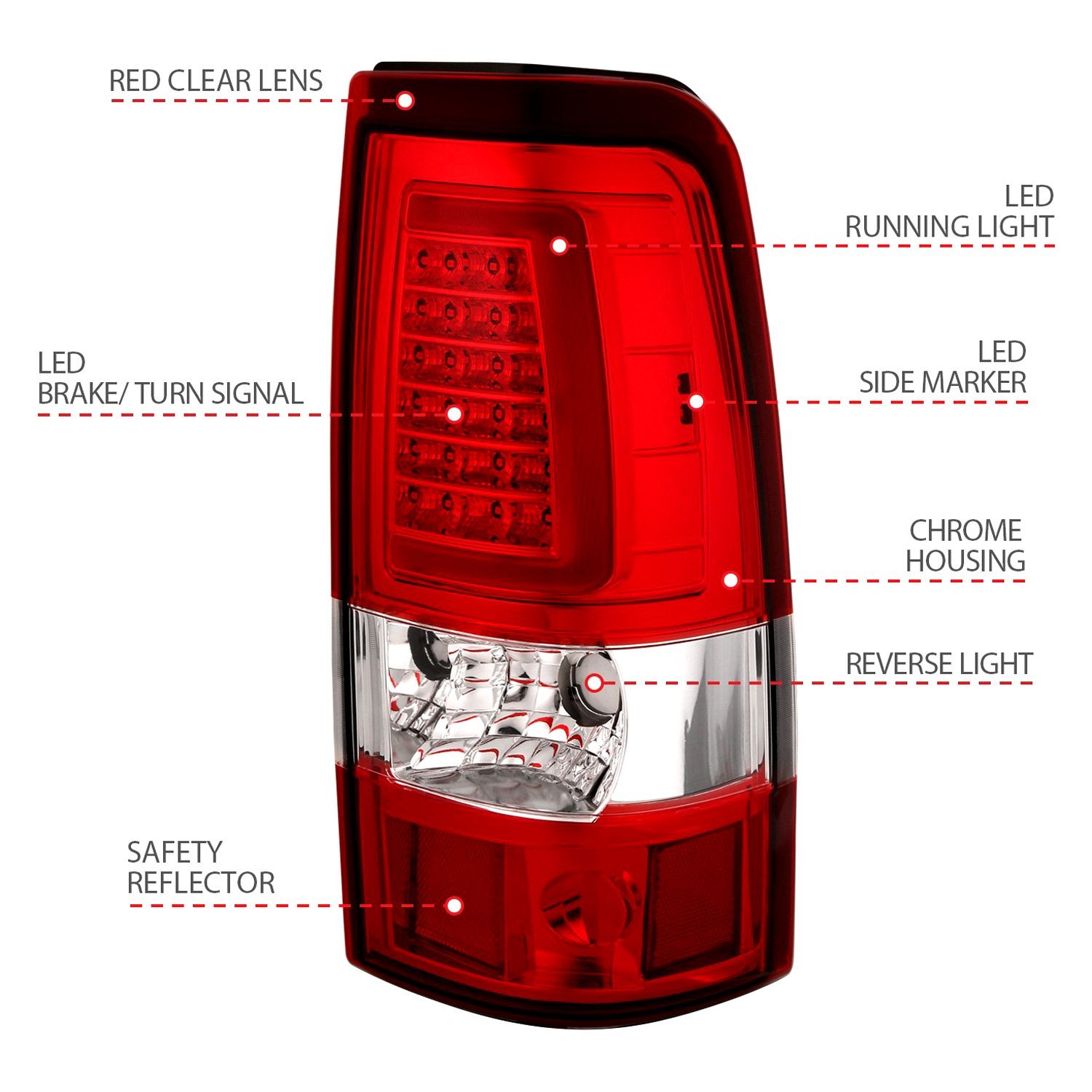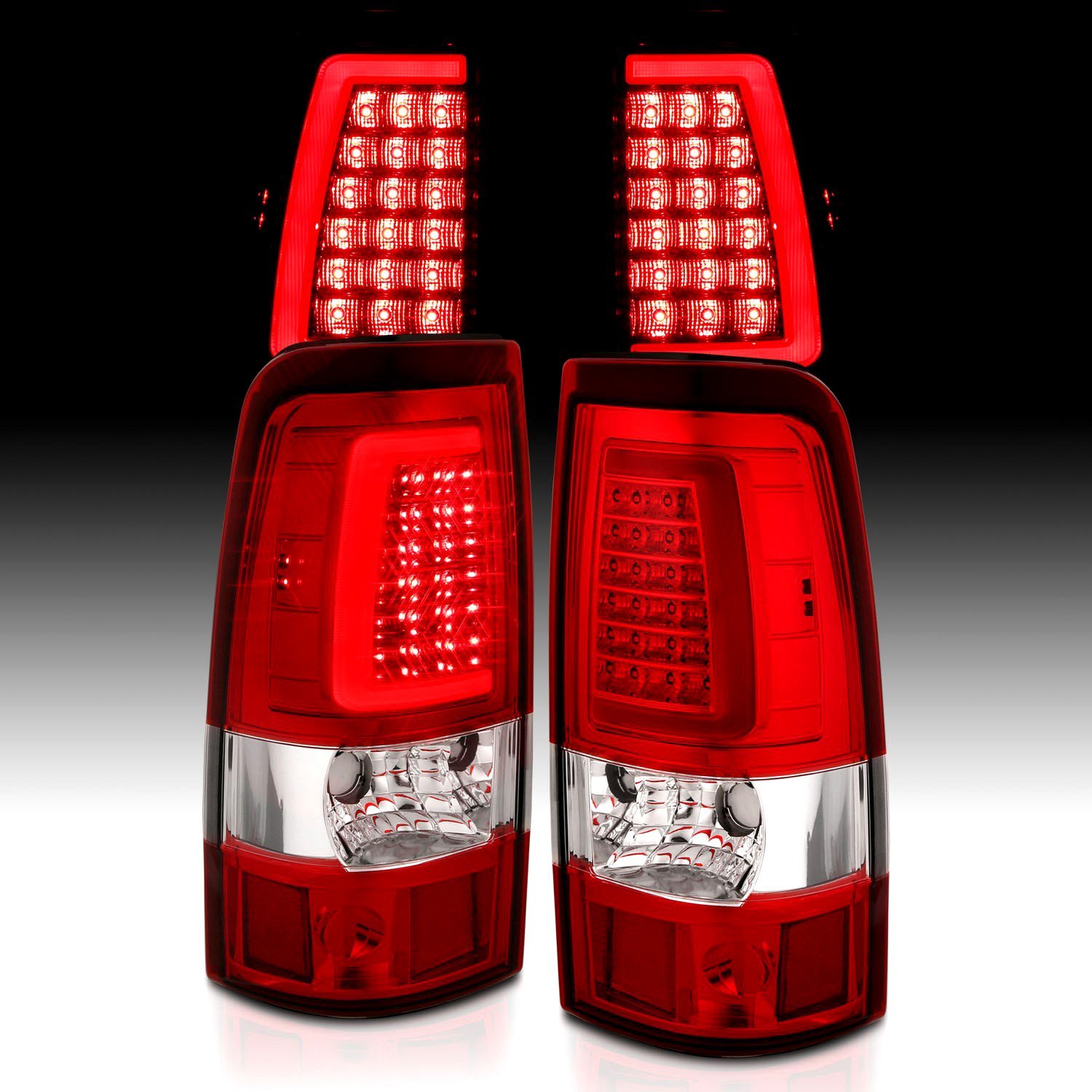 Driver and Passenger Side Chrome/Red Plank Style Fiber Optic LED Tail Lights (311332) by Anzo®. 1 Pair. Chrome housing, red/clear lens. Tired of your dull factory tail lights and feel a strong need to upgrade the rear of your auto with something really special? Featuring far more brightness and endurance than stock bulbs, these stunning tail lights by Anzo are just the ticket to transform a simple piece of machinery into a classy vehicle. These lights combine fiber optic strips which act as running lights and super bright LEDs that provide excellent illumination.