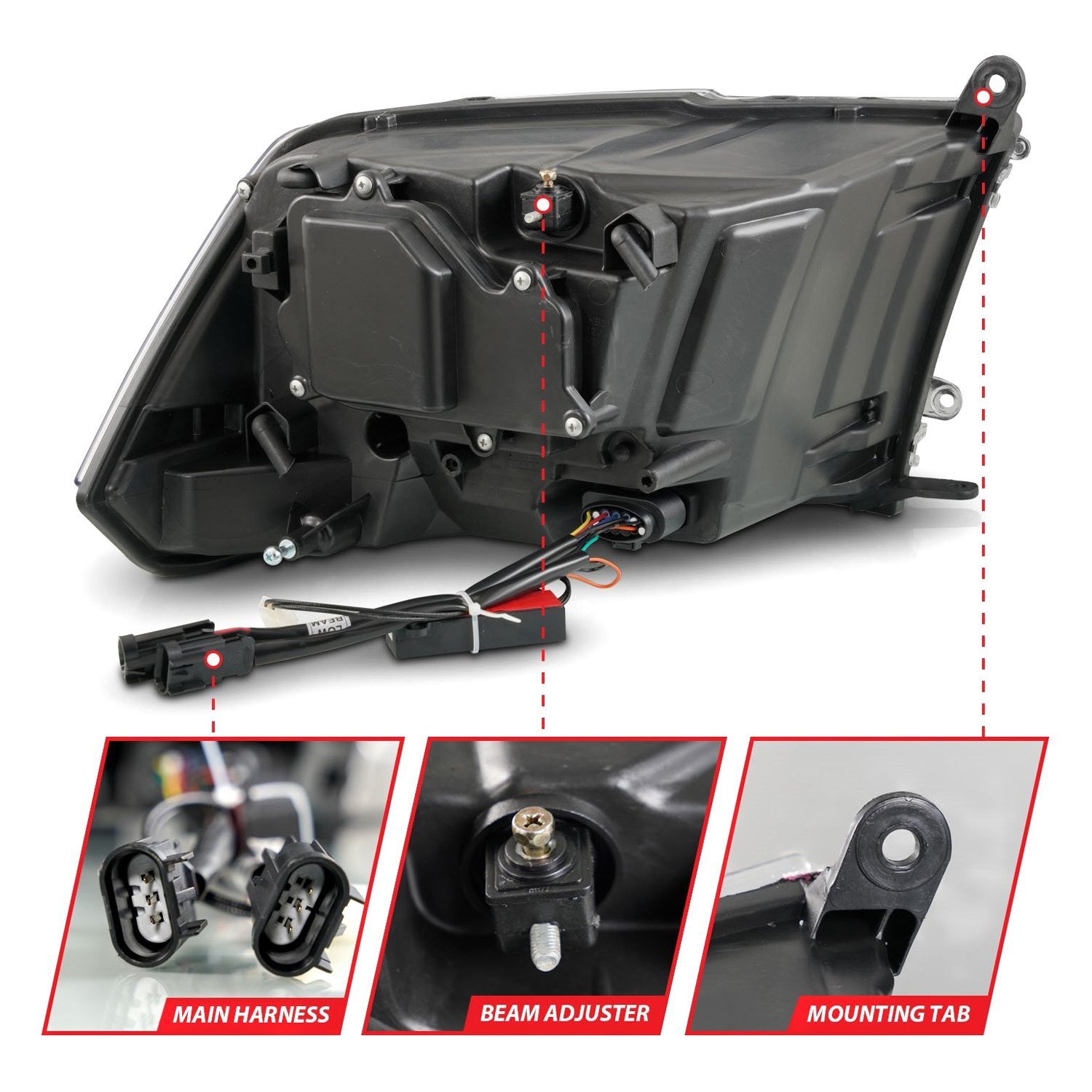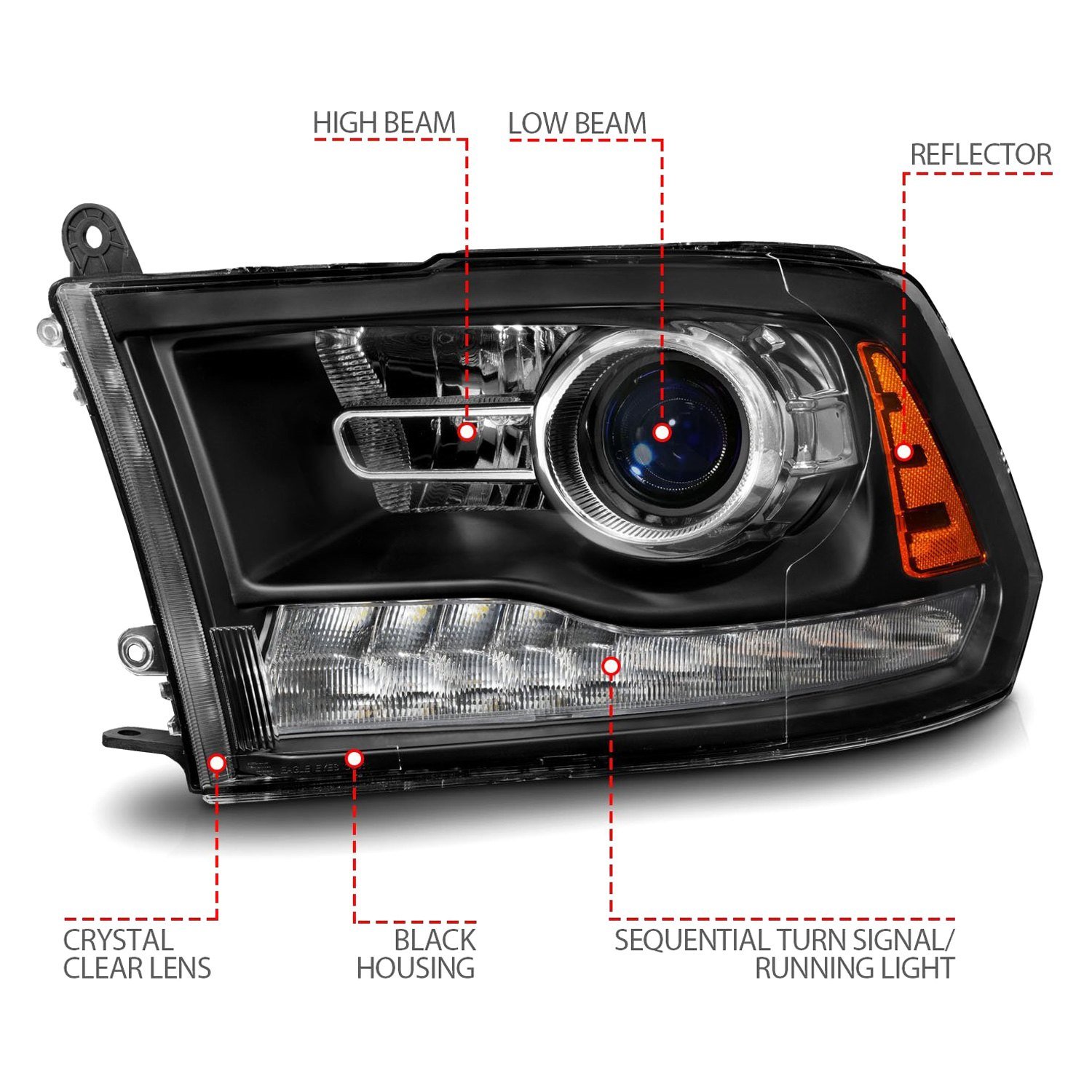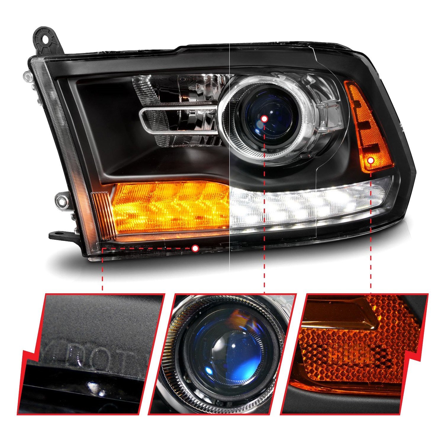 Plank Style Driver and Passenger Side Mist Black Projector Headlights with LED DRL and Sequential Turn Signal by Anzo®. 1 Pair. Mist Black housing, clear lens. Bulb: H7 low beam (included), H9 high beam (included). These powerful lights are brighter than factory and are designed using the latest computer assisted design technology. Anzo uses this CAD technology to not only ensure that you get the best functioning headlights, but that they also look great and fit perfectly.