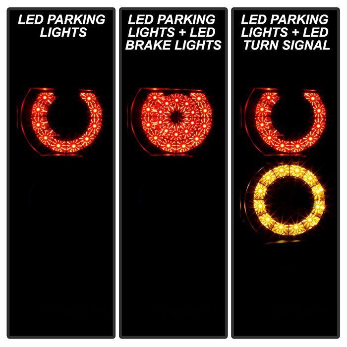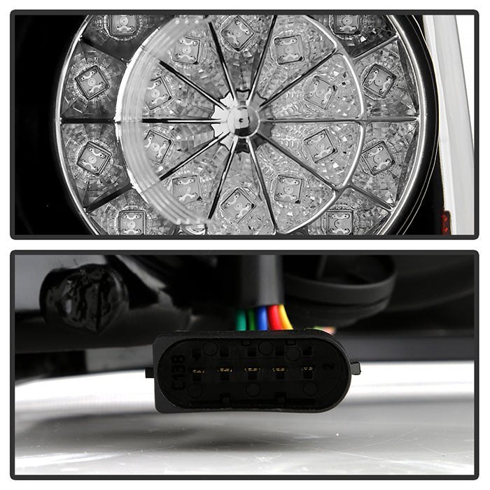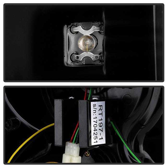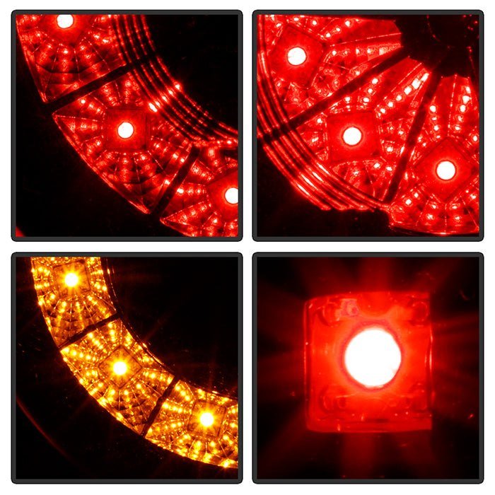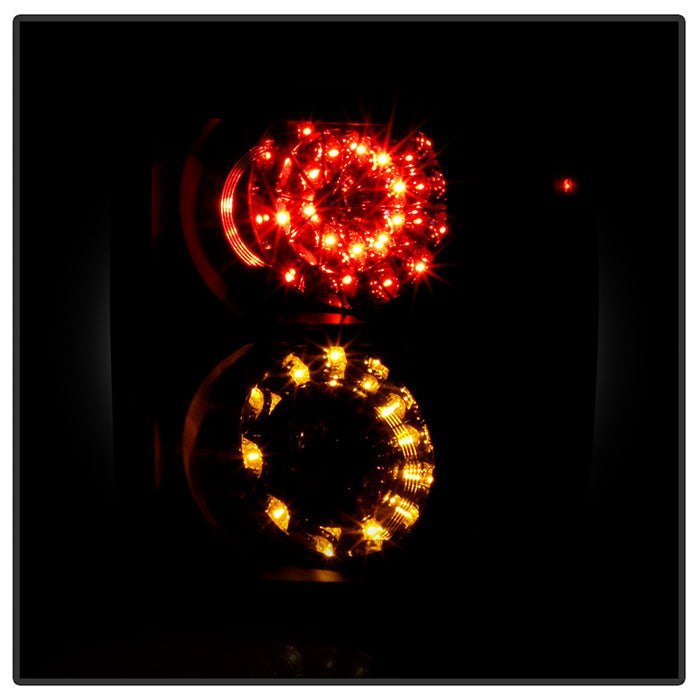 Driver and Passenger Side Black/Red LED Tail Lights by Spyder®. 1 Pair. Black housing, red/clear lens. Backed by a 1-year warranty. Replace your boring monochromatic tail lights with these bolt-on LED tail lights, and give your vehicle an exclusive look like nothing else on the road. The interesting detail is just visible beyond the lens, and the bright LEDs will upgrade your lighting and increase your safety. Meets all federal regulations for highway use.