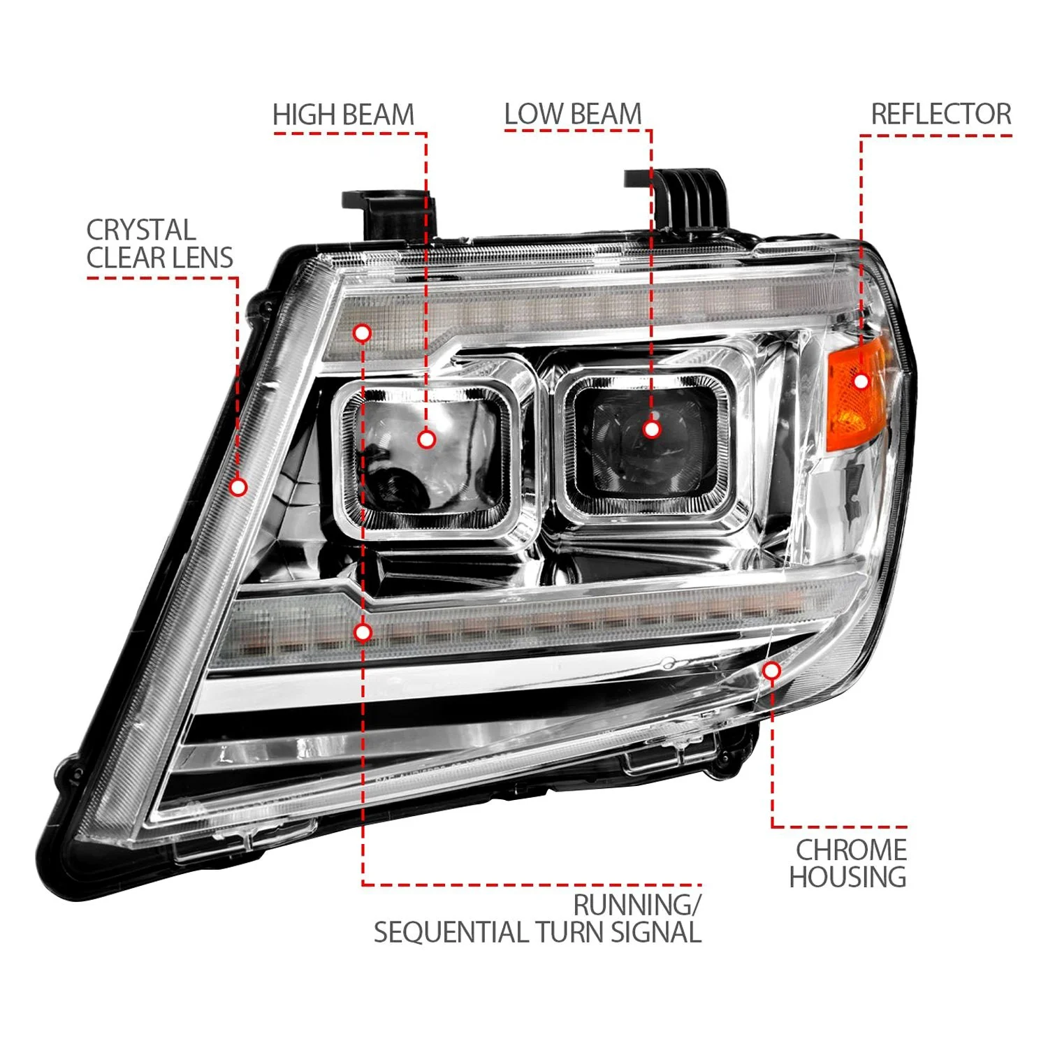 Plank Style Driver and Passenger Side Chrome Projector Headlights with Sequential LED DRL by Anzo®. 1 Pair. Chrome housing, clear lens. Bulb: H7 low beam (included), H9 high beam (included). These powerful lights are brighter than factory and are designed using the latest computer assisted design technology. Anzo uses this CAD technology to not only ensure that you get the best functioning headlights, but that they also look great and fit perfectly.