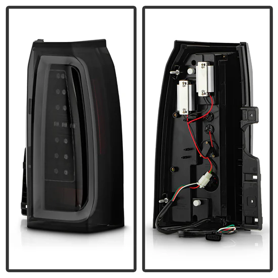 Apex Series Driver and Passenger Side Fiber Optic LED Tail Lights by Spyder®. 1 Pair. Black housing, smoke lens. Backed by a 1-year warranty. Replace your boring monochromatic tail lights with these bolt-on fiber optic LED tail lights and give your vehicle an exclusive look like nothing else on the road. The parts combine fiber optic strips that act as running lights and ultra-bright LEDs that ensure the knockout radiance. Meets all federal regulations for highway use.