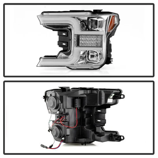 Signature Series Driver and Passenger Side Chrome DRL Bar Projector Headlights with LED Sequential Turn Signal by Spyder®. 1 Pair. Chrome housing. Bulb: H7 low beam (included), H1 high beam (included), LED signal. Backed by a 1-year warranty. Improve your vision and your vehicle’s appearance with these bolt-on headlight assemblies. The projector beam headlights will produce a sharper, more focused beam of light for safer driving at night, the bright LED lights will make your vehicle more visible to other drivers, and the LEDs and custom headlight housing will give your ride an exclusive, unique look. Meets all federal regulations for street use.