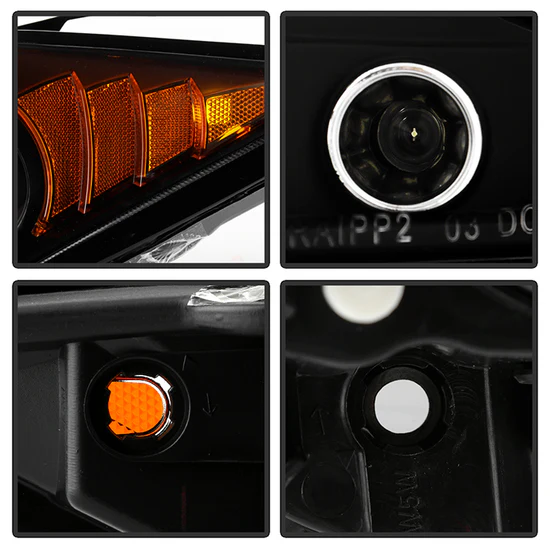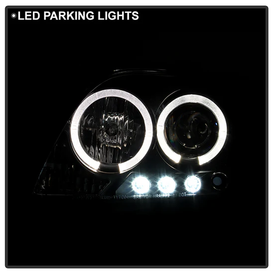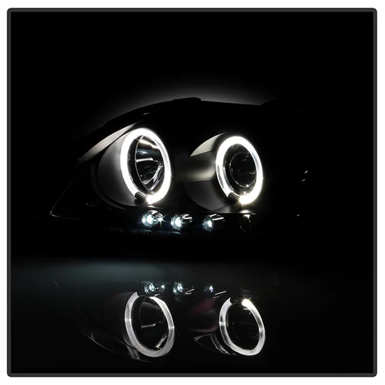 Signature Series Driver and Passenger Side Black Halo Projector Headlights with Parking LEDs (PRO-YD-TTC04-HL-AM-BK) by Spyder®. 1 Pair. Black housing, clear lens. Bulb: 9006 (HB4) low beam (not included), H1 high beam (included). Backed by a 1-year warranty. Improve your vision and your vehicle’s appearance with these bolt-on headlight assemblies. The projector beam headlights will produce a sharper, more focused beam of light for safer driving at night, the bright Halos and LED lights will make your vehicle more visible to other drivers, and the Halos, LEDs and custom headlight housing will give your ride an exclusive, unique look. Meets all federal regulations for street use.