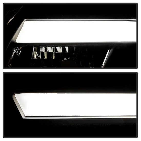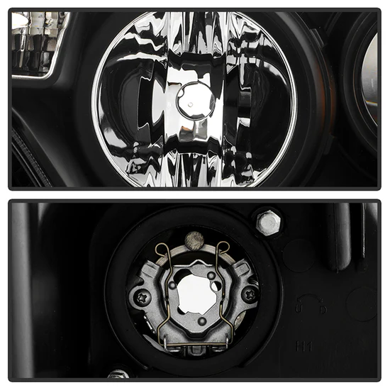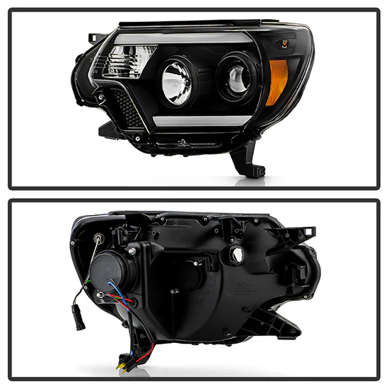 Signature Series Driver and Passenger Side Black LED Light Tube Projector Headlights (PRO-YD-TT12-LBDRL-BK) by Spyder®. 1 Pair. Black housing, clear lens. Bulbs: H1 high beam and H7 low beam. Backed by a 1-year warranty. Provide your vehicle with an exclusive look it deserves with these projector headlights designed for stock lights direct replacement. The perfect blend of projector lights and DRL Bar will not only dramatically improve the appearance of your vehicle but also provide better illumination for greater driving safety and increased visibility to make it more conspicuous. Meets all federal regulations for street use.