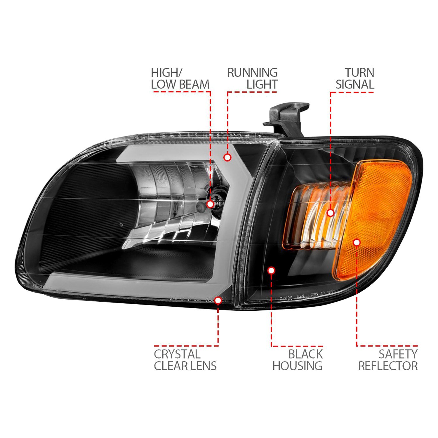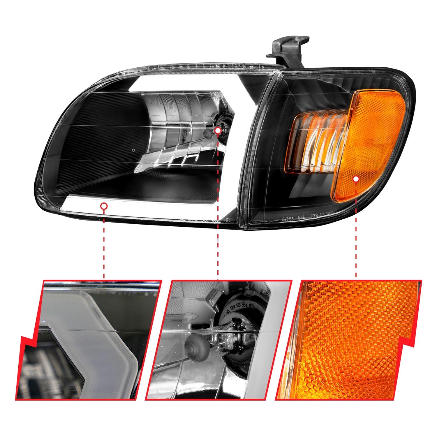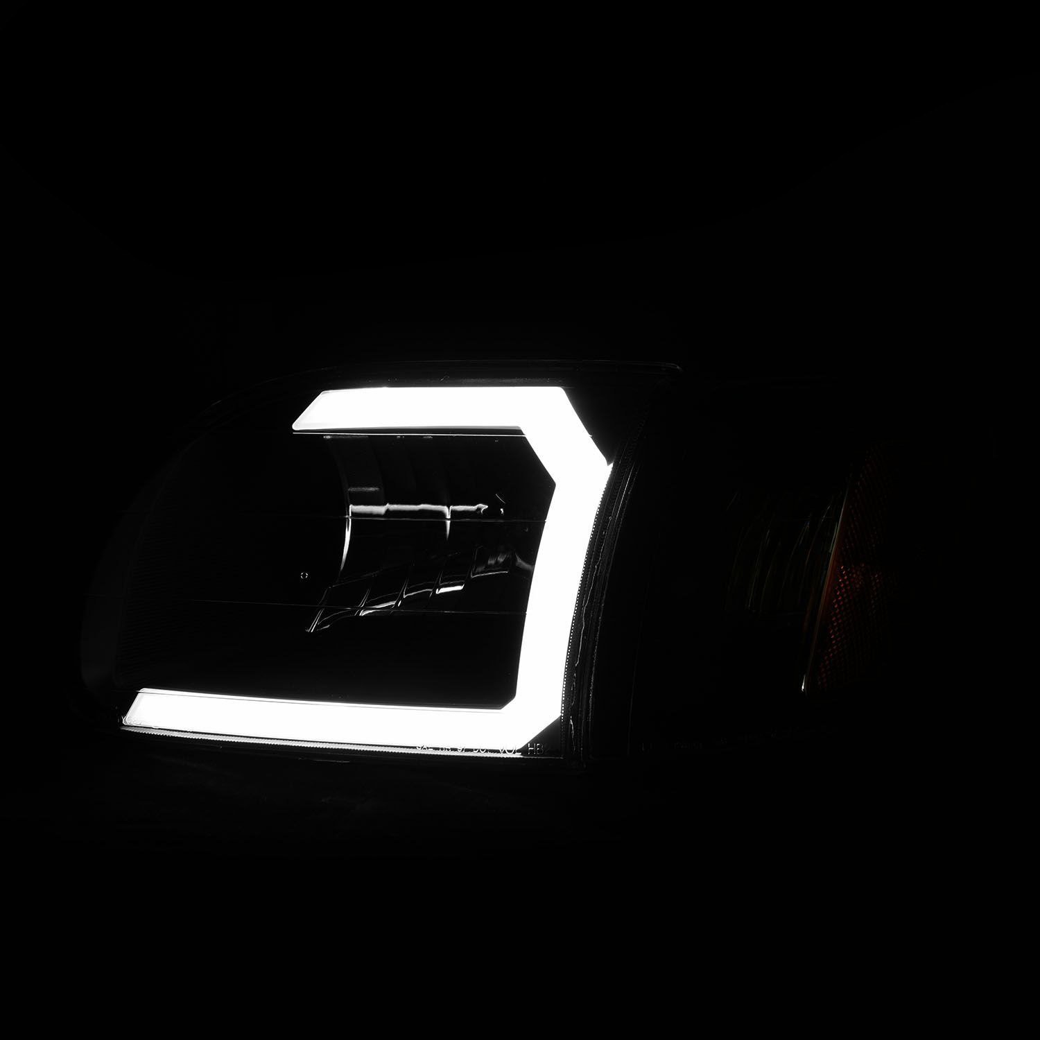 Plank Style Driver and Passenger Side Black LED U-Bar™ Headlights with Turn Signal/Corner Lights by Anzo®. 4 Pieces. Black housing, clear lens. Bulb: H4 (9003 / HB2) low/high beam (included). These powerful lights are brighter than factory and are designed using the latest computer assisted design technology. Anzo uses this CAD technology to not only ensure that you get the best functioning headlights, but that they also look great and fit perfectly.
