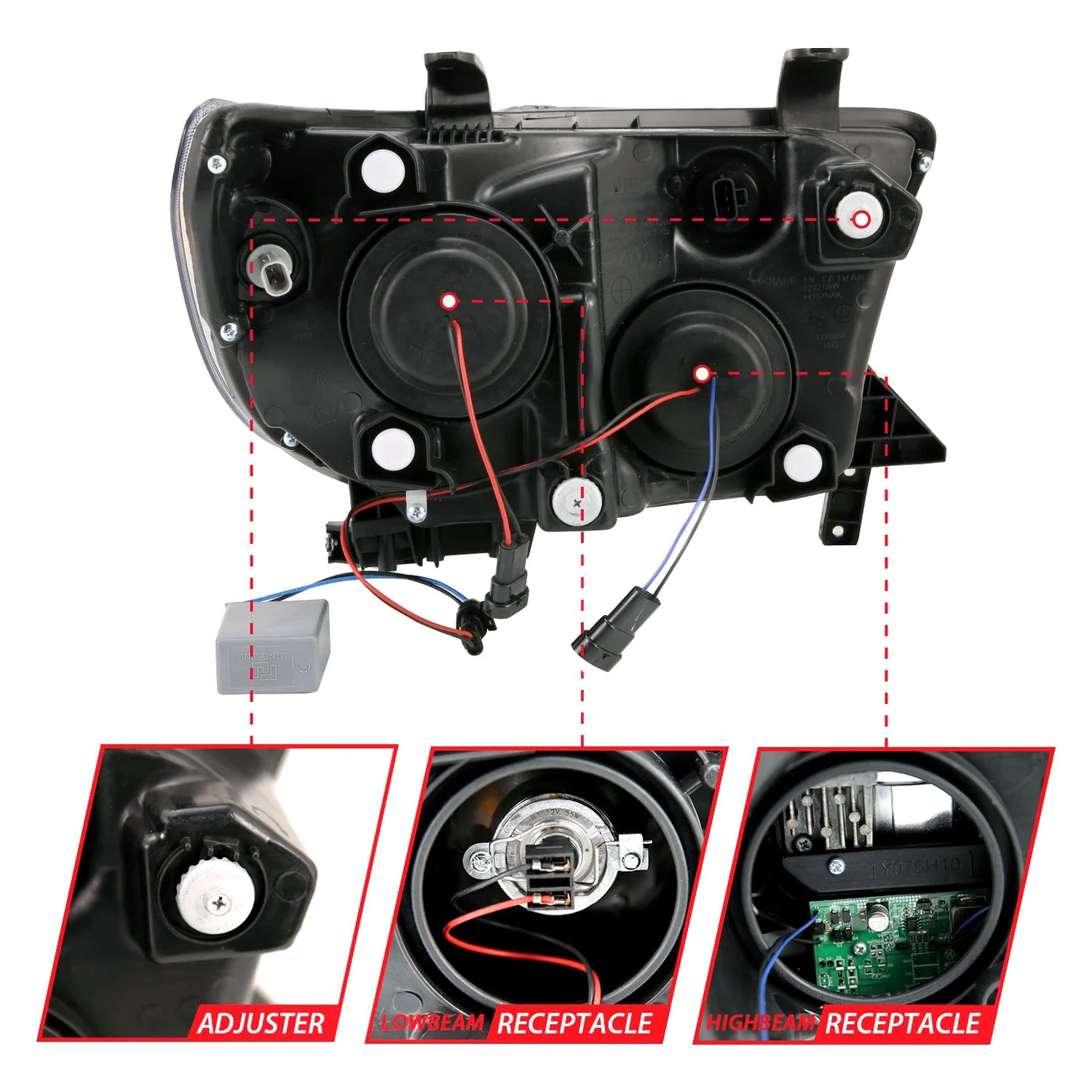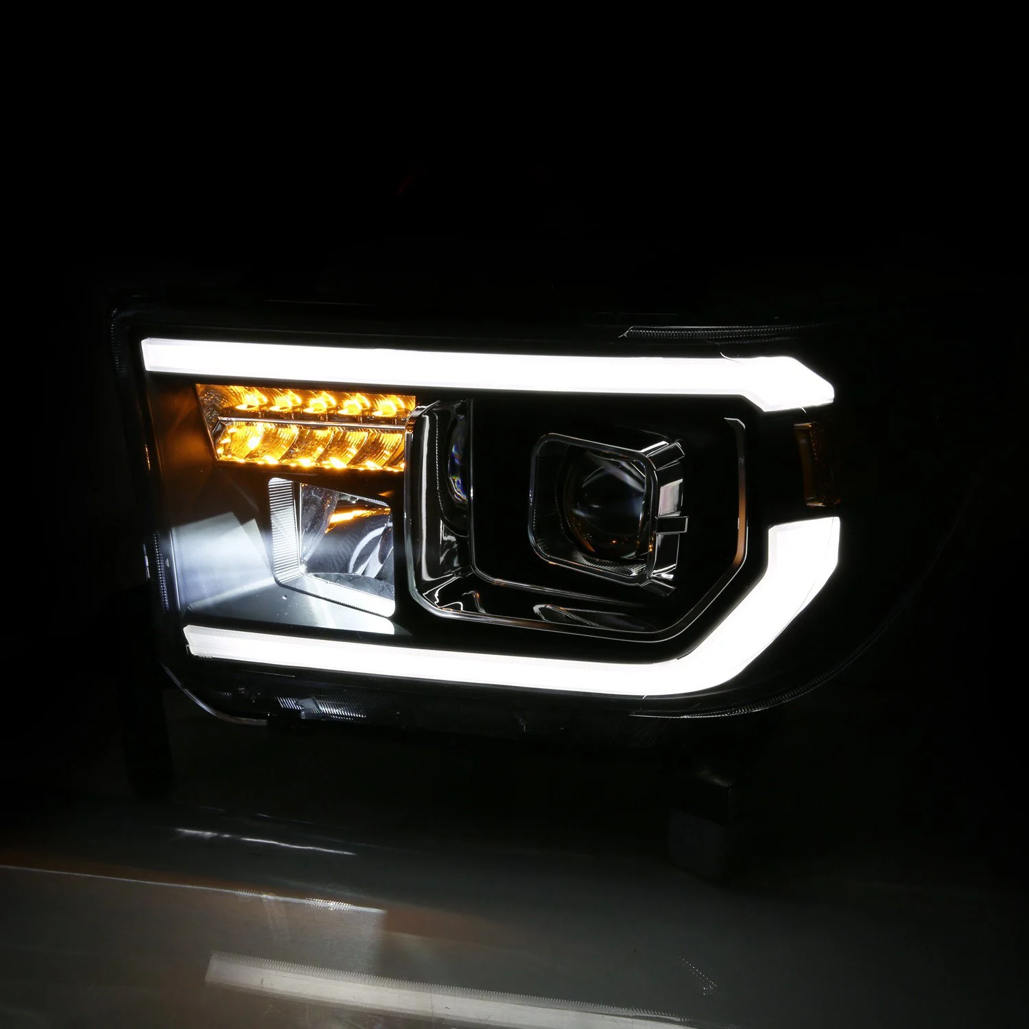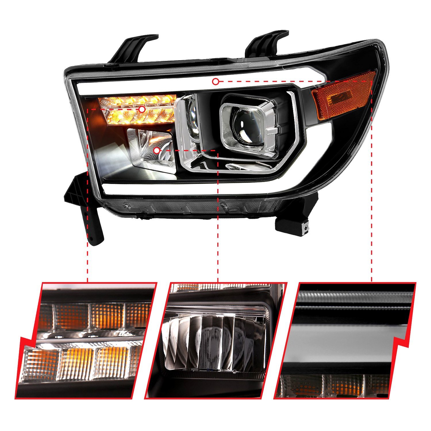 Plank Style Driver and Passenger Side Black U-Bar™ Projector LED Headlights by Anzo®. 1 Pair. Black housing, clear lens. With Amber LED Turn Signal. Bulb: H7 low beam (included), LED high beam (included). These powerful lights are brighter than factory and are designed using the latest computer assisted design technology. Anzo uses this CAD technology to not only ensure that you get the best functioning headlights, but that they also look great and fit perfectly.